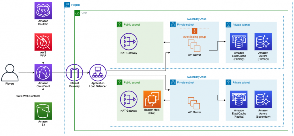 아래는 AWS에서 포스팅한 비동기 웹기반 게임의 아키텍처 이다.