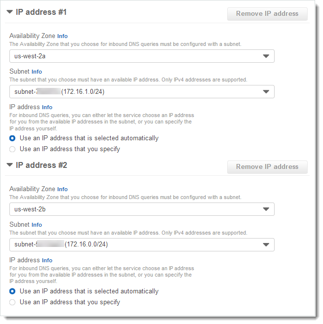 2. 이 워크로드에는 인바운드와 아웃바운드 모두를 선택했습니다. 우선 인바운드 쿼리 구성을 수행하겠습니다. 이름을 입력하고 VPC를 선택합니다. VPC 내에 하나 이상의 서브넷을 지정합니다(이 경우에는 가용성을 위해 두 개 선택). 해당 서브넷에서 엔드포인트로 사용할 특정 IP 주소를 지정하거나 Route 53 Resolver에서 자동으로 해당 주소를 지정하게 합니다.