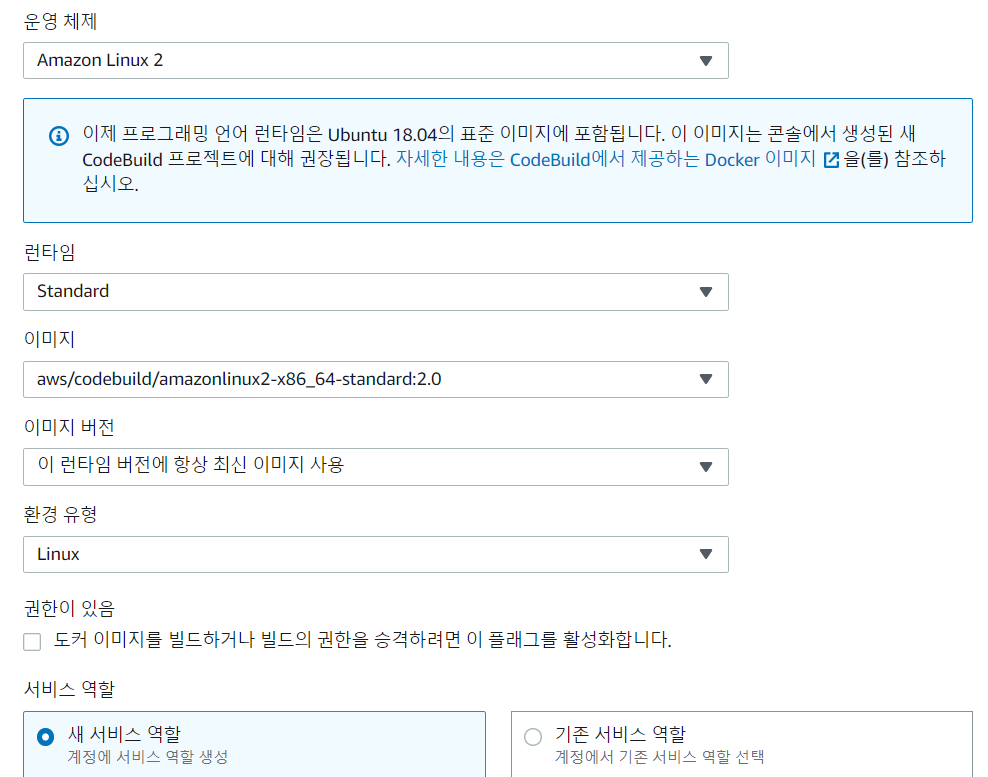 3. CodeBuild 실행하는 데 사용하는 운영 체제, 프로그래밍 언어 실행 시간 및 도구의 조합을 나타냅니다.