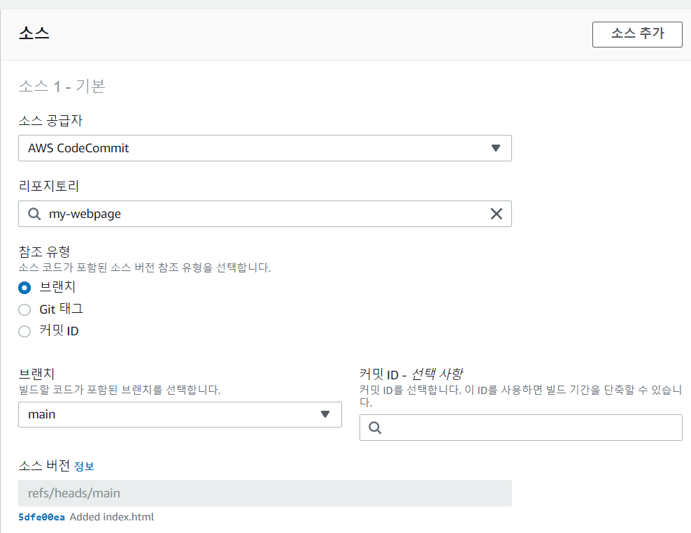 (필자의 경우 CodeCommit을 레파지토리로 사용하였고, 브랜치를 기준으로 빌드를 수행코자합니다.)