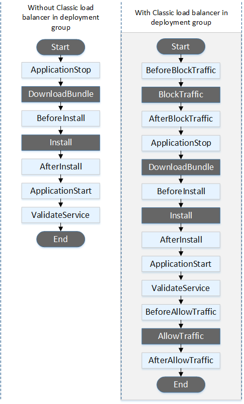 In-place deployments의 경우 Event들은 다음과 같이 LifeCycle이 수행된다. 이는 CodeDeploy가 이미 정해놓은 순서이다. 아래의 그림들에서 짙은 회색은 이미 콘솔에서 결정이 난 부분이기 때문에 스크립팅할 수 없다.