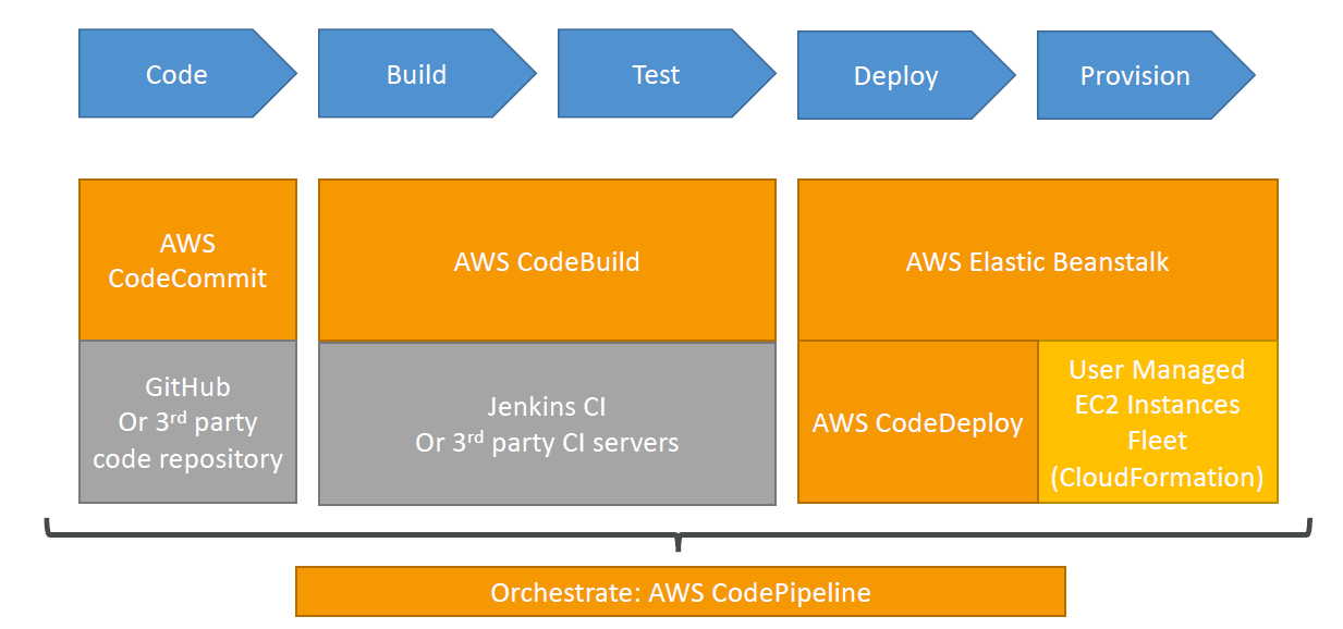 - Deploy는 AWS CodeDeploy, Beanstalk, CloudFormation, ECS 등..