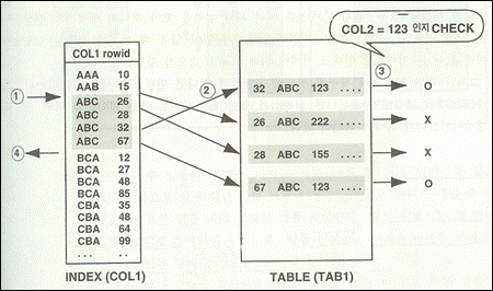 - B*Tree 방법으로 COL1='ABC' 와 COL=123인 첫 번째 로우를 찾는다.