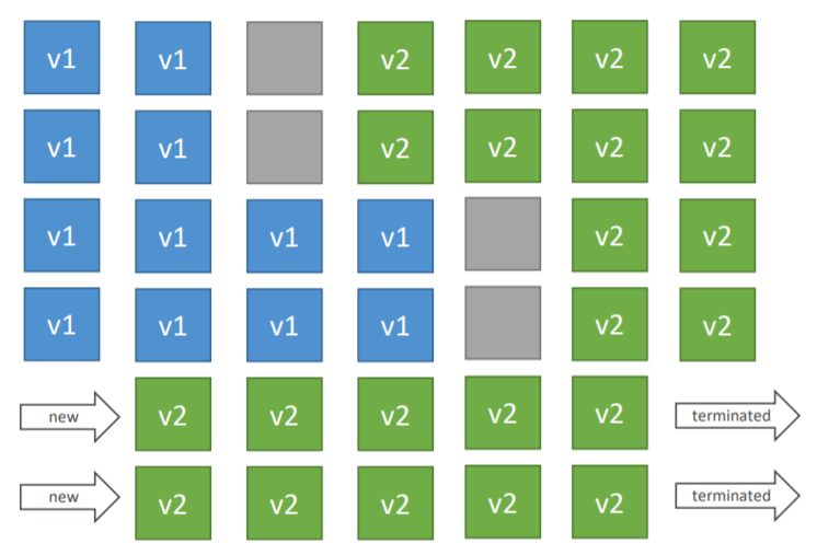 Rolling 방식과 유사하나, 추가적으로 v2자원을 할당하고 개발이 완료된 후에 삭제하는 방식