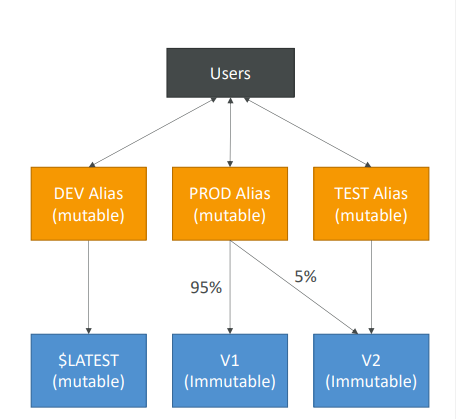 사용자는 "dev", "test", "prod" Alias를 정의하고 각 다른 Lambda 버전에 할당할 수 있다.