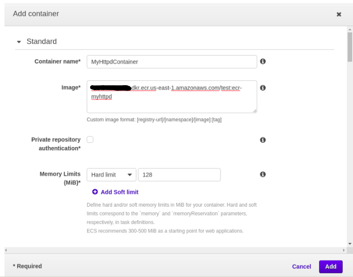 5. 리소스 할당 및 "컨테이너 추가" 클릭