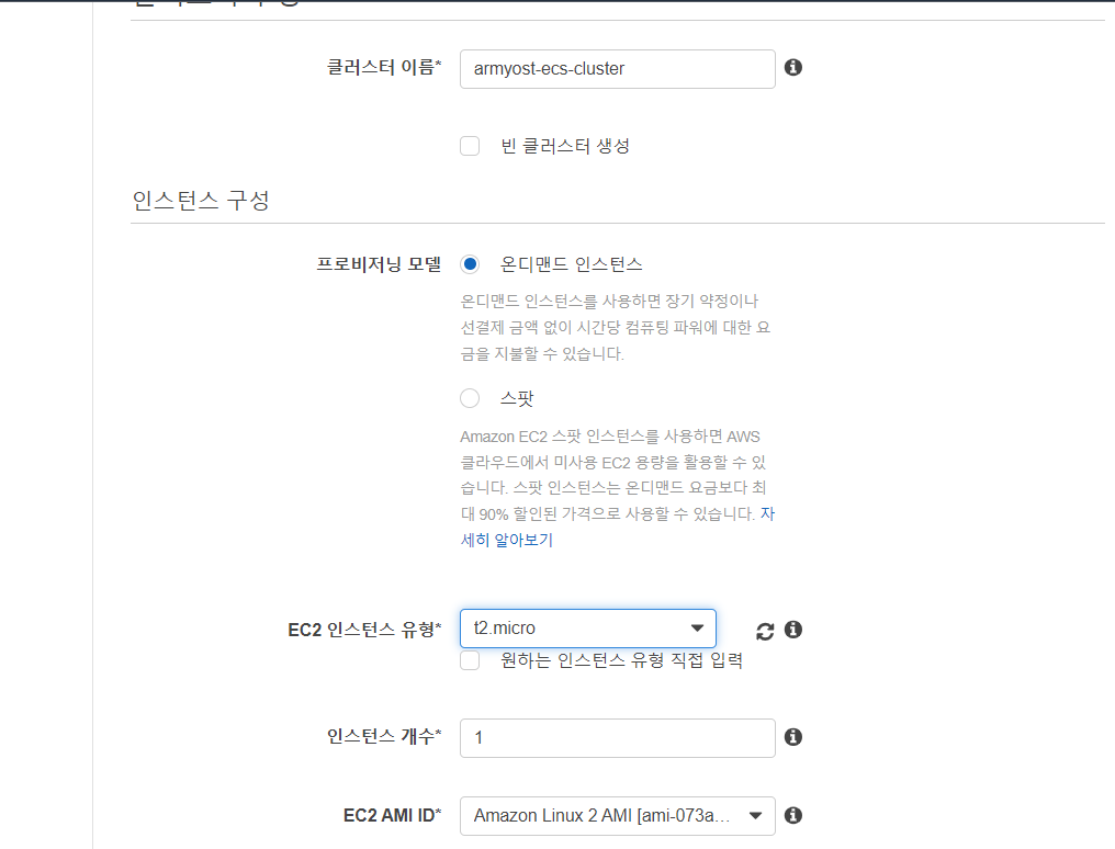 4. 디폴트로 선택된 온디멘드 인스턴스를 두고 기본 정보를 입력. AMI ID는 디폴트 AMI사용
