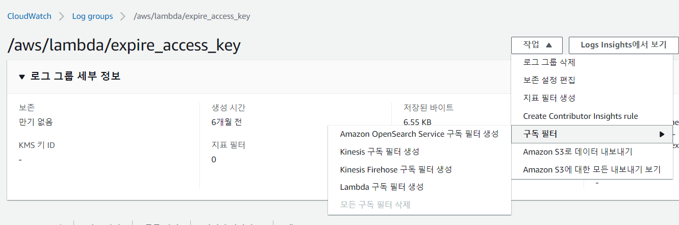 1. [AWS Console]-[CloudWatch]-[로그그룹] 에서 해당 로그로 접근하여 "구독필터"-"Amazon OpenSearch Service구독필터 생성" 클릭