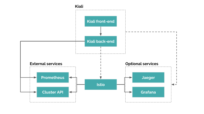 Kiali의 데이터 소스로는 Prometheus, Jaeger, Cluster API를 사용한다.