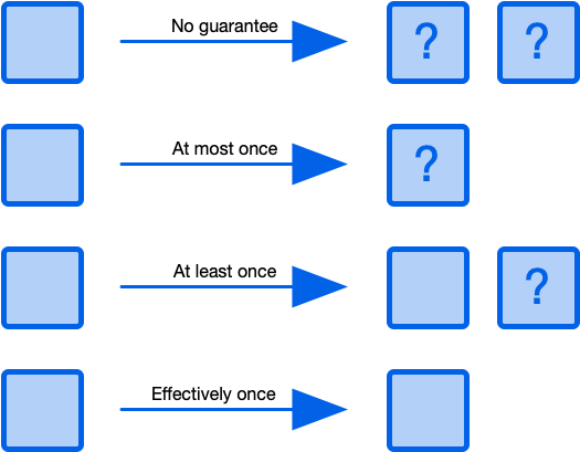 메시지 시스템들의 메시지 전송 방식에는 '적어도 한번 전송', '최대 한번 전송', '정확히 한번 전송'이 있습니다.