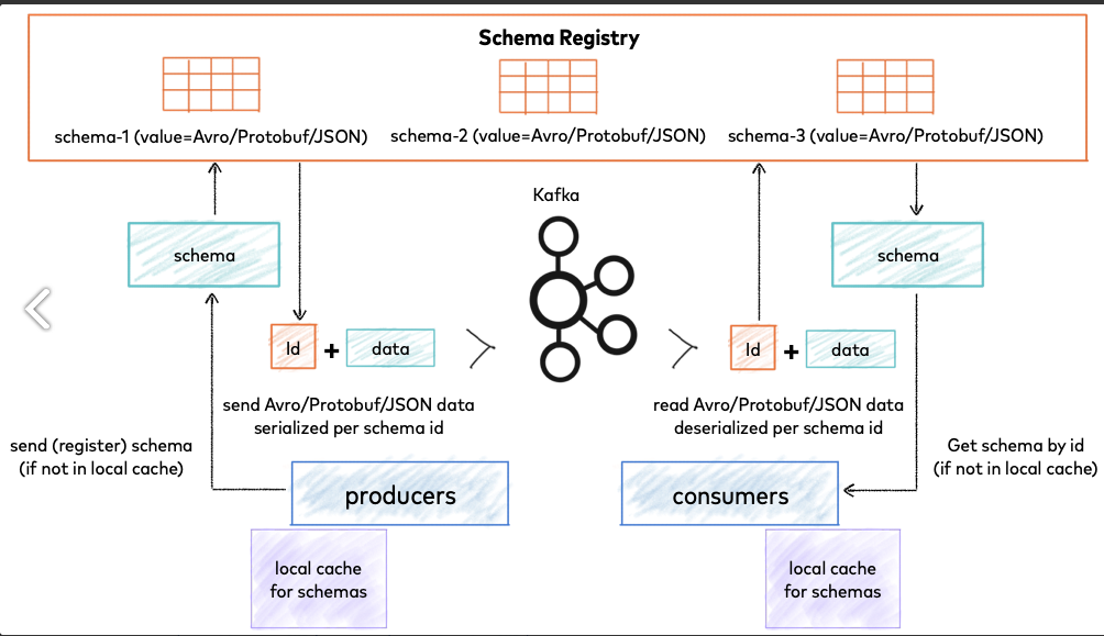 클라이언트들이 스키마 정보를 사용하기 위해서는 프로듀서와 컨슈머, 스키마 레지스트리간에 직접 통신이 이뤄져야 합니다. 프로듀서는 스키마 레지스트리에 스키마를 등록하고 스키마 레지스트리는 프로듀서에 의해 등록된 스키마 정보를 kafka의 내부 토픽에 저장합니다. 프로듀서는 스키마 레지스트리에 등록된 스키마의 ID와 메시지를 kafka로 전송하고 컨슈머는 스키마 ID를 스키마 레지스트리로부터 읽어온 후 프로듀서가 전송한 스키마ID와 메시지를 kafka로 전송하고 컨슈머는 스키마 ID를 스키마 레지스트리로부터 읽어온 후 프로듀서가 전송한 스키마ID와 메시지를 조합해 읽을 수 있습니다. 스키마 레지스트리가 지원하는 데이터 포맷을 사용해야 하는데, 가장 대표적인 포맷은 에이브로입니다.