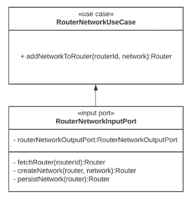 네트워크를 라우터에 추가하는 오퍼레이션을 설명하는 유스케이스 인터페이스를 정의했다. 해당 유스케이스를 구현애 입력 포트를 만드는 방법을 살펴보자. 아래와 같이 입력포트 구현을 통해 라우터에 네트워크를 추가하는 유스케이스 목표를 만족시키기 위해 소프트웨어가 수행하는 동작에 대한 명확한 뷰를 갖게 된다.