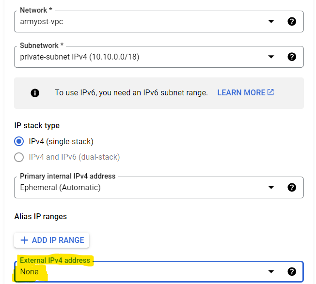 External IP 세팅을 None으로 한다. ← 이게 귀찮.. 그리고 실수 포인트 발생할 수 있음.