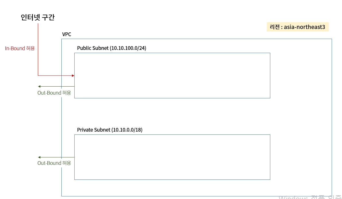 위 그림에서 public-subnet은 In/Out Bound Traffic이 Internet 영역과 모두 허용되고, private-subnet은 In-Bound Traffic 은 미허용, Out-Bound Traffic은 허용한다.