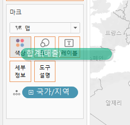 5. 맵 기반하에 표현하고싶은 데이터를 '테이블' 에서 선택한뒤 드래그엔 드룹으로 '마크'영역의 '색상'에 놓는다.