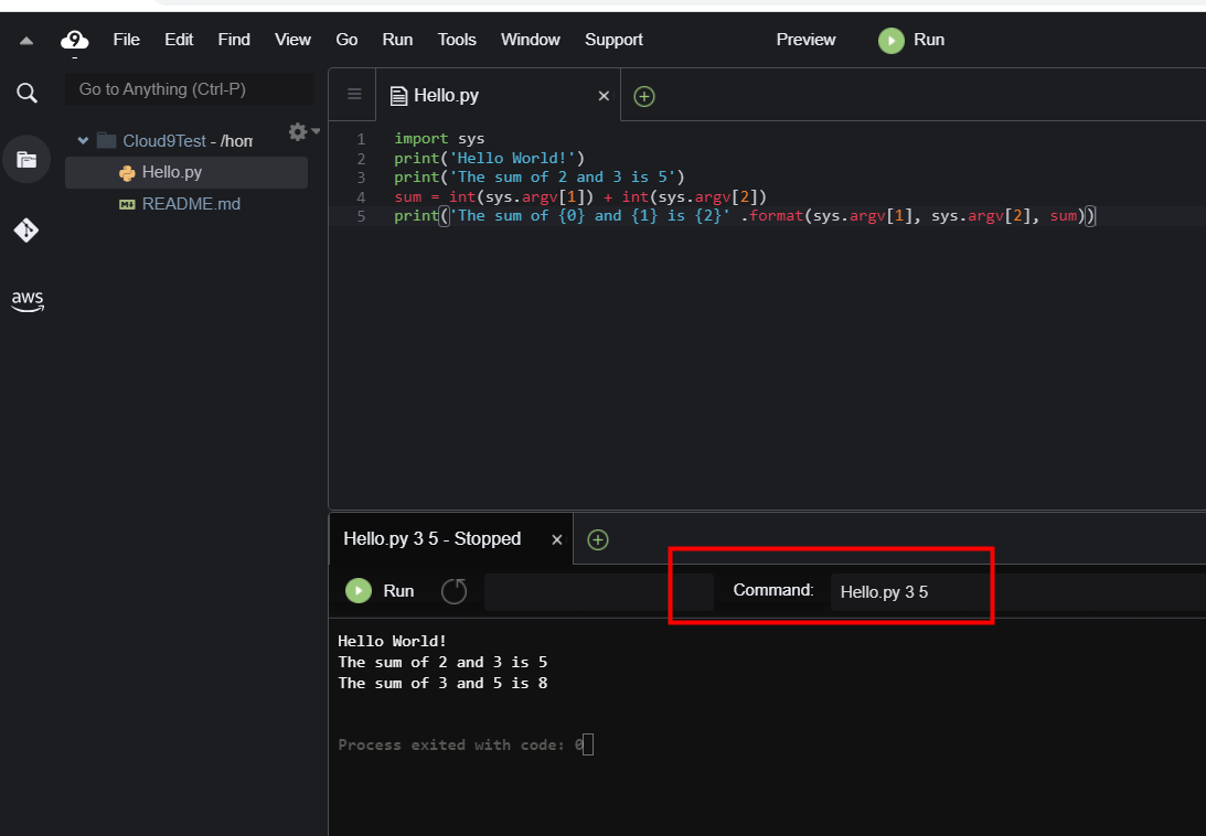 8. Command 란에 py파일 이름과 파라미터 값을 입력하고 Run합니다.