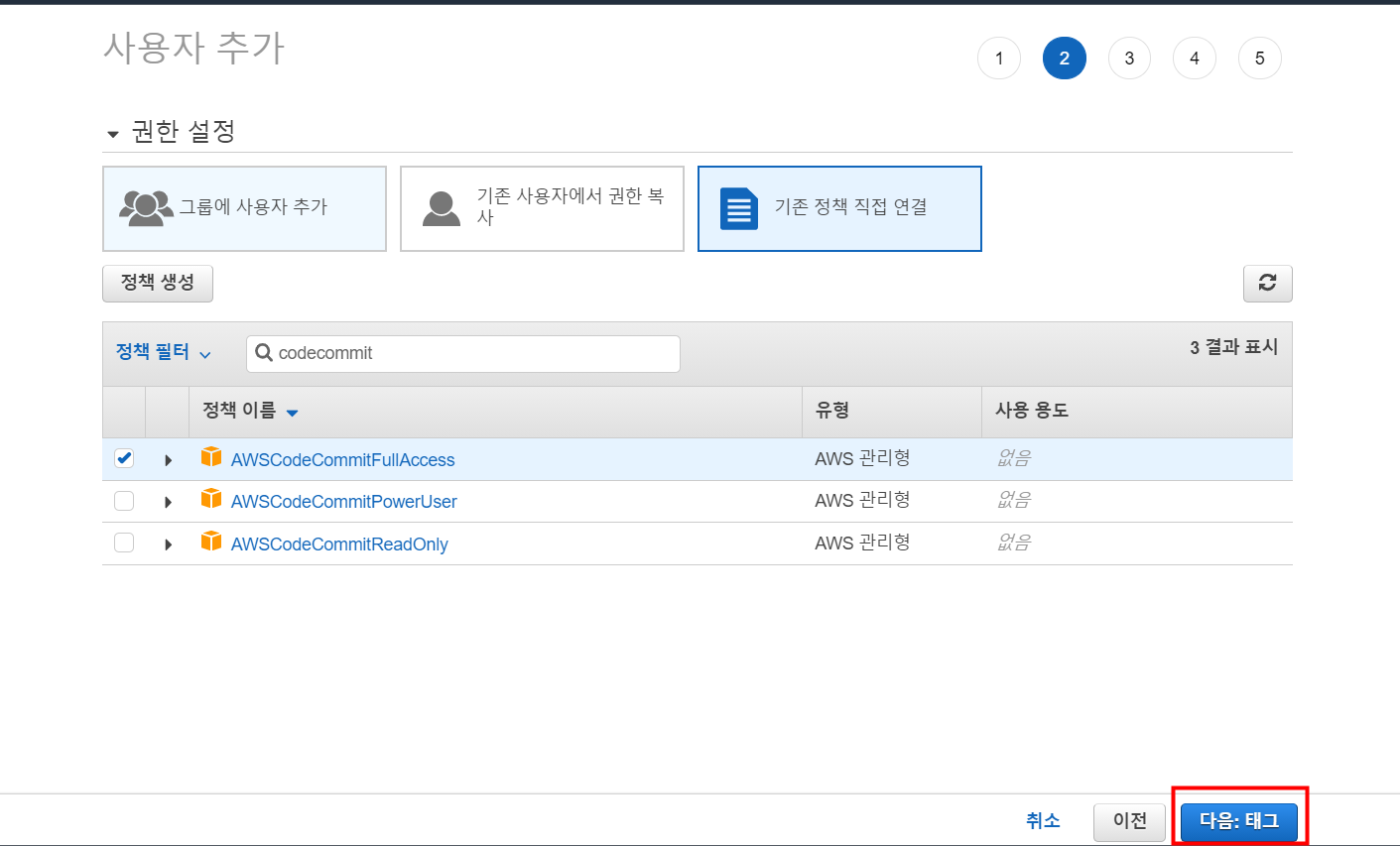 3. [사용자추가] 페이지에서 [기존 정책 직접 연결] 버튼을 클릭합니다. '정책' 필터에 'CodeCommit'입력 후 'AWSCodeCommitFullAccess'를 체크하고 [다음:태그] 버튼 클릭, [태그] 페이지에서 [다음:검토] 버튼을 클릭합니다.