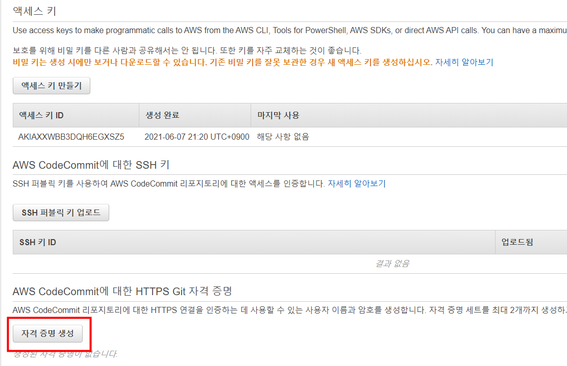 8. 'AWS CodeCommit에 대한 HTTPS Git 자격 증명' 항목에서 [자격증명생성] 버튼을 클릭합니다.