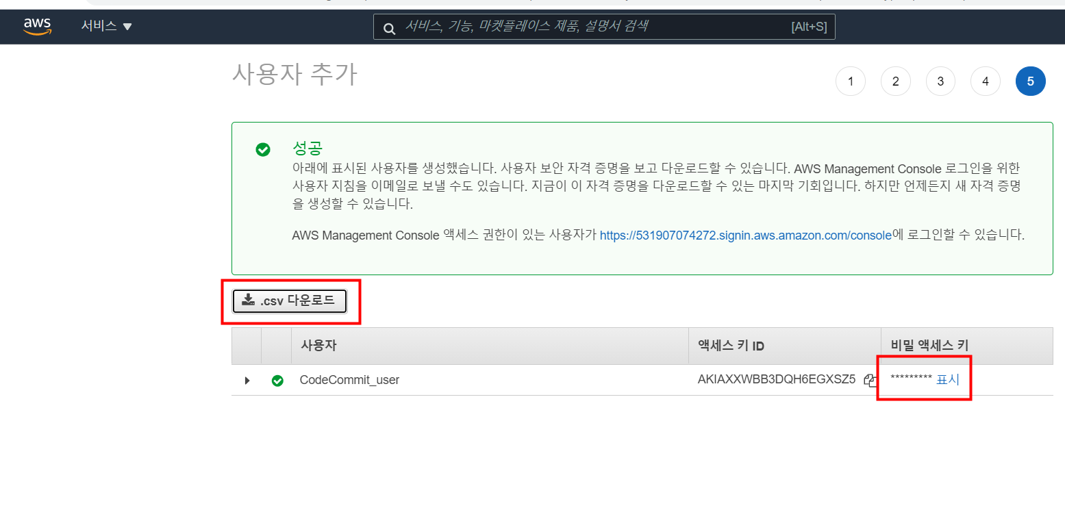 5. [사용자추가] 페이지에서 AWS CLI 연결에 사용할 엑세스 키 ID와 비밀 엑세스 키를 PC에 저장하기 위해 [CSV 다운로드] 버튼을 클릭하여 자격 증명을 PC로 다운로드 합니다.