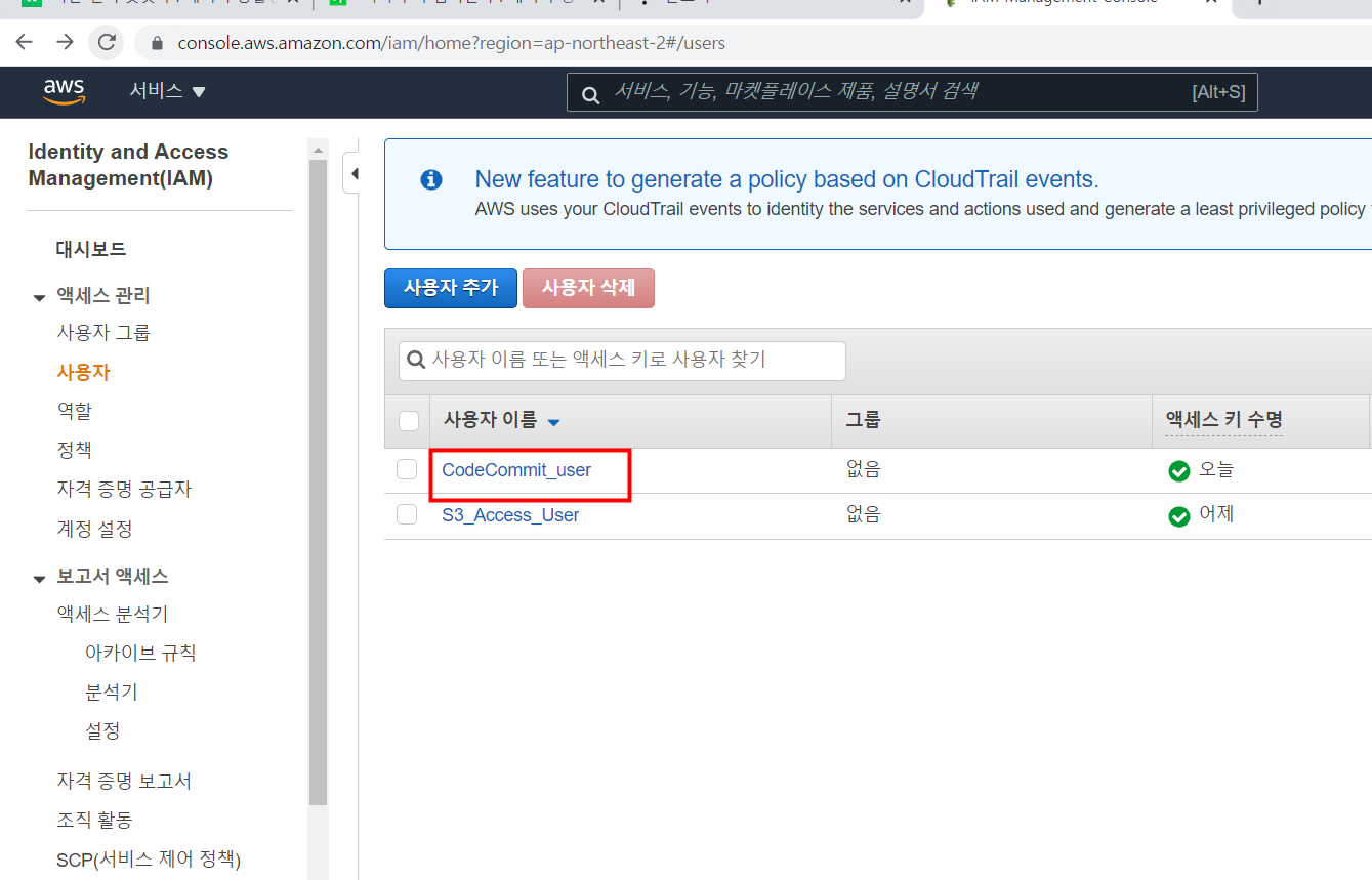 CodeCommit 실행을 위해 필요한 IAM 계정 생성 방법과 Git HTTPS 접속을 위해 필요한 자격 증명 생성 방법을 알아보겠습니다. 이를통해 Cloud9에서 CodeCommit 접속하는 경우와 외부 시스템에서 CodeCommit 접속 시 자격 증명 정보와 IAM 계정을 활용하게 됩니다.
