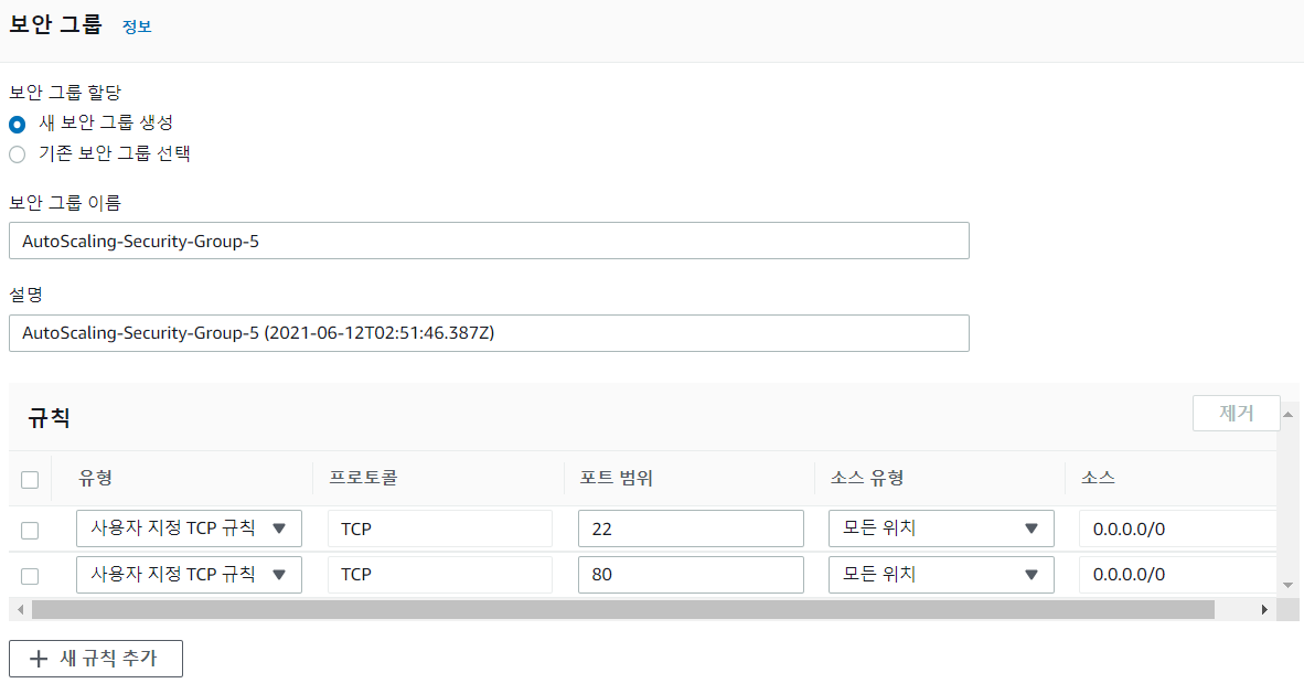 ※ 그리고 SSH를 위한 22번 포트, 웹서비스를 위한 포트를 아래와 같이 열어줍니다.