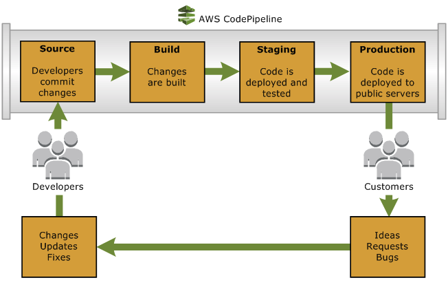 AWS CodePipeline은 코드에 변경이 있을 때마다 사용자가 사전에 정의한 릴리스 모델을 기반으로 애플리케이션의 릴리스 프로세스의 빌드, 테스트, 배포 단계에 걸친 프로세스에 대해 자동화를 수행합니다.