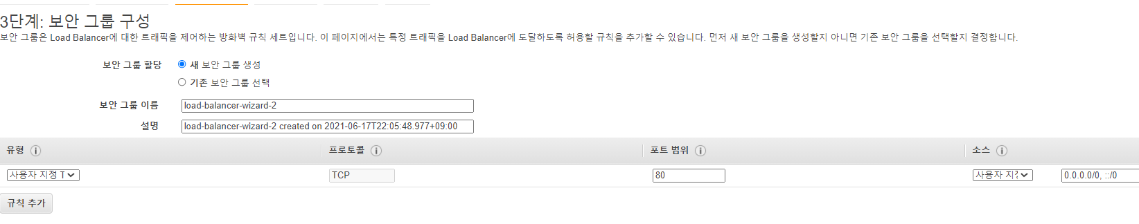 6. 새 보안그룹을 만듭니다. 1단계에서의 리스너와 동일한 구성으로 만듭니다.