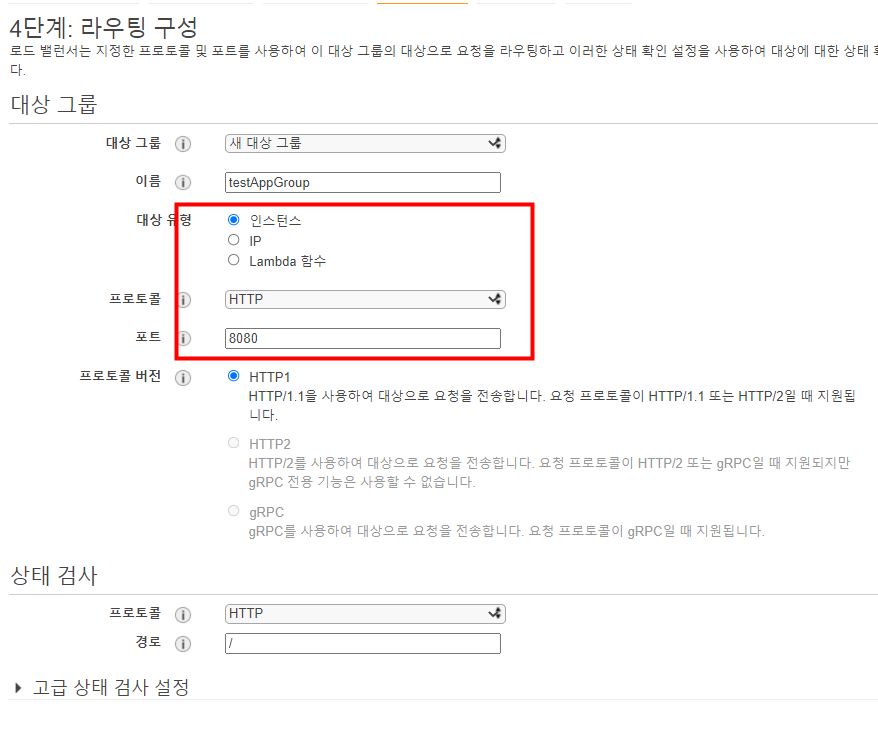 7. 라우팅의 대상을 설정합니다. EC2인스턴스를 대상으로 하고 있으므로 대상유형은 '인스턴스'가 되고, 저의 경우 EC2에서 8080포트로 서비스를 수신중이기 때문에 포트를 8080으로 설정하였습니다.