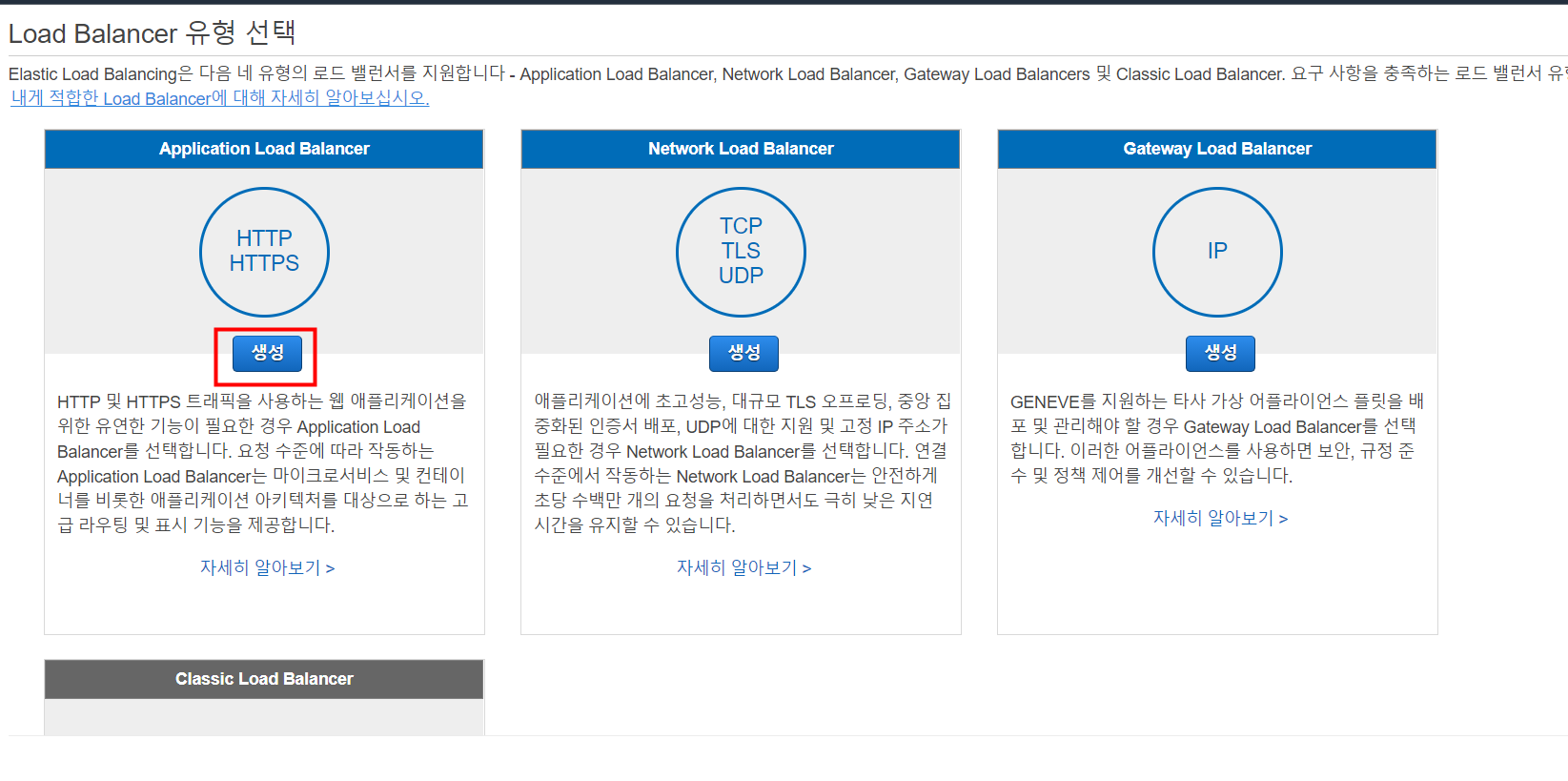 3. 어플리케이션을 로드벨런싱 할 예정이므로 'Application LoadBalancer'를 선택합니다.