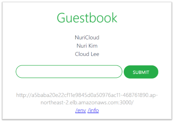 마지막 과정에서 EXTERNAL-IP가 이용 가능하게 되면 웹 브라우저를 포트 3000의 해당 주소로 가리켜 게스트 북을 확인합니다. 예: a5baba20e22cf11e9845d0a50976ac11-468761890.ap-northeast-2.elb.amazonaws.com:3000