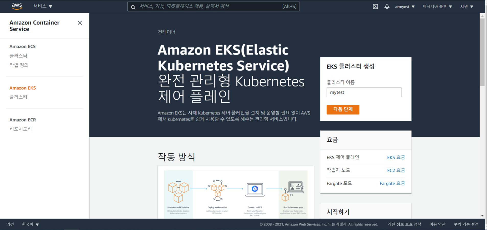 ClusterName: 위 단계에서 생성한 Amazon EKS 클러스터 이름과 정확하게 일치해야 합니다. 그렇지 않은 경우 Worker Node를 클러스터에 조인할 수 없습니다. (예: mytest)