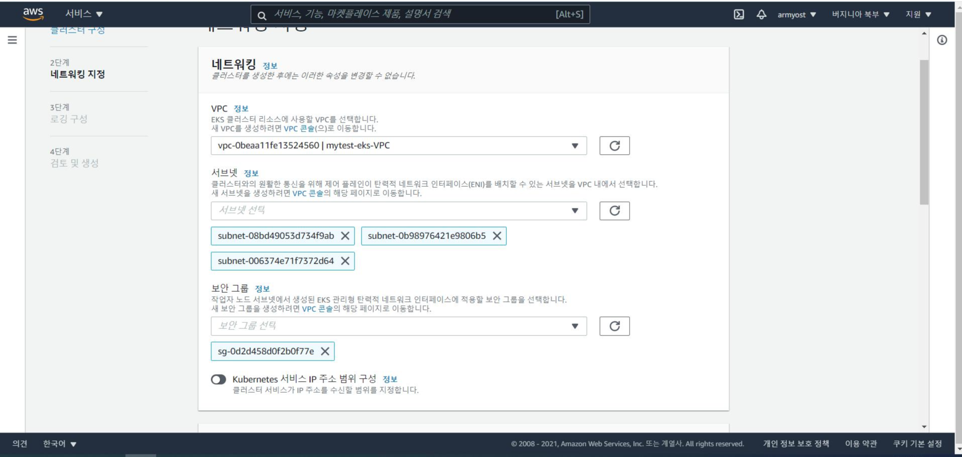 ClusterControlPlaneSecurityGroup: 위 단계에서 생성된 AWS CloudFormation 출력의 SecurityGroups 값을 선택합니다.(예: mytest-eks-ControlPlaneSecurityGroup-GNNM8LC0N44O)